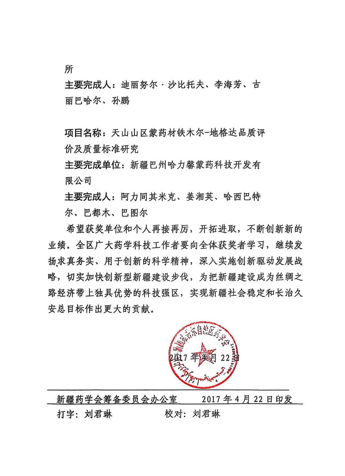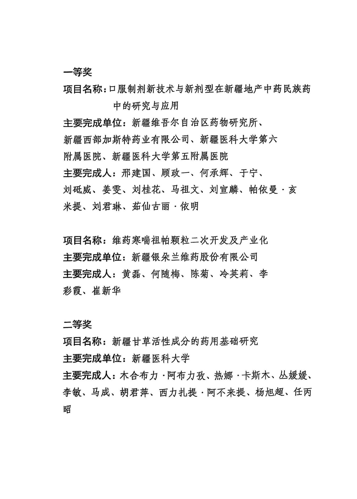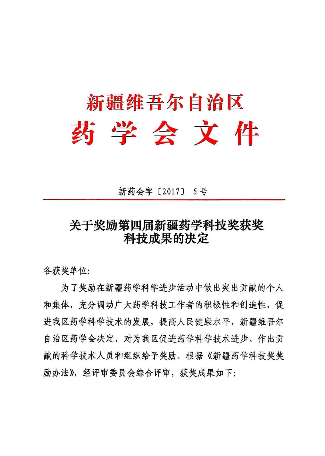 关于奖励第四届新疆药学科技奖获奖科技成果的决定
