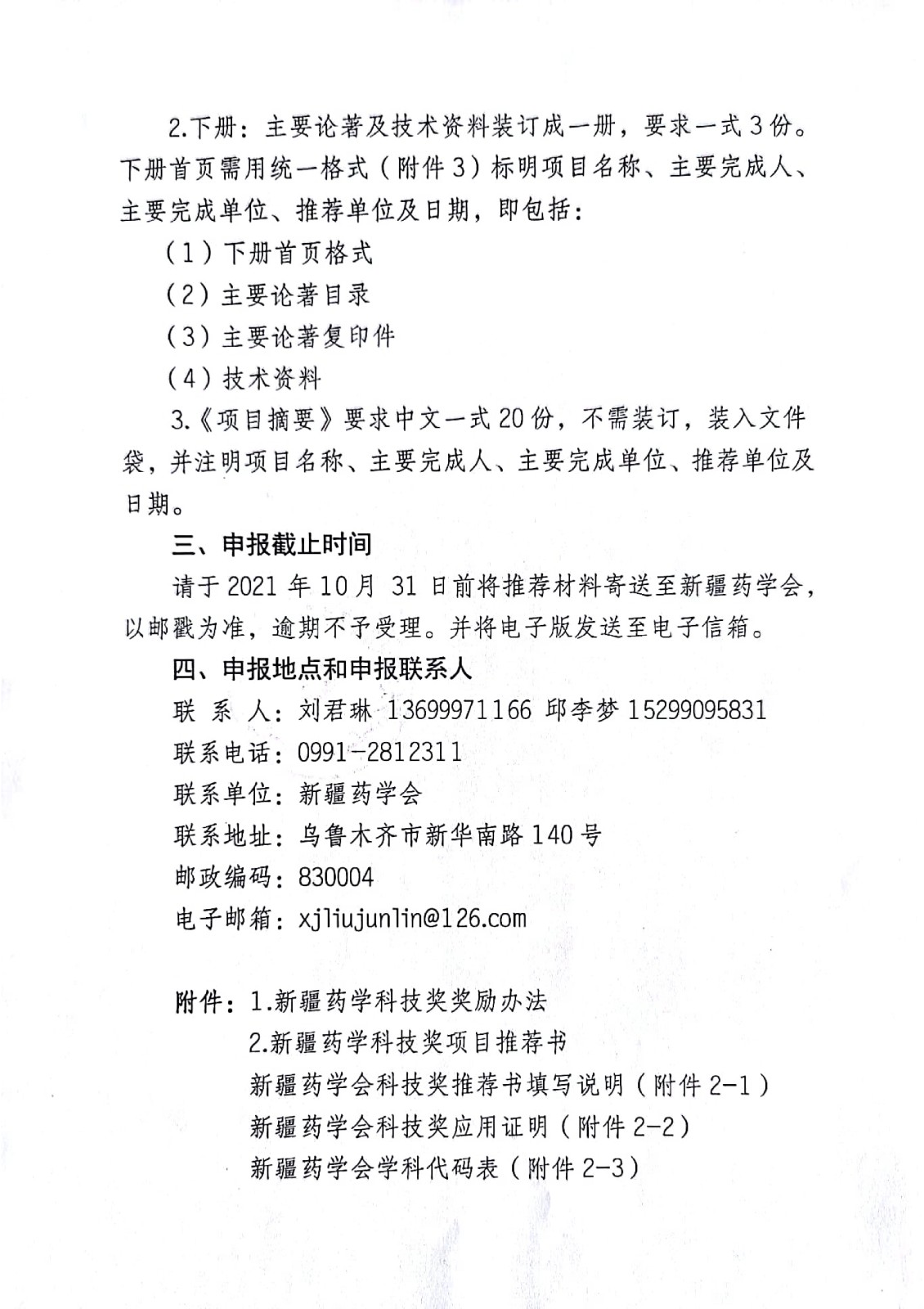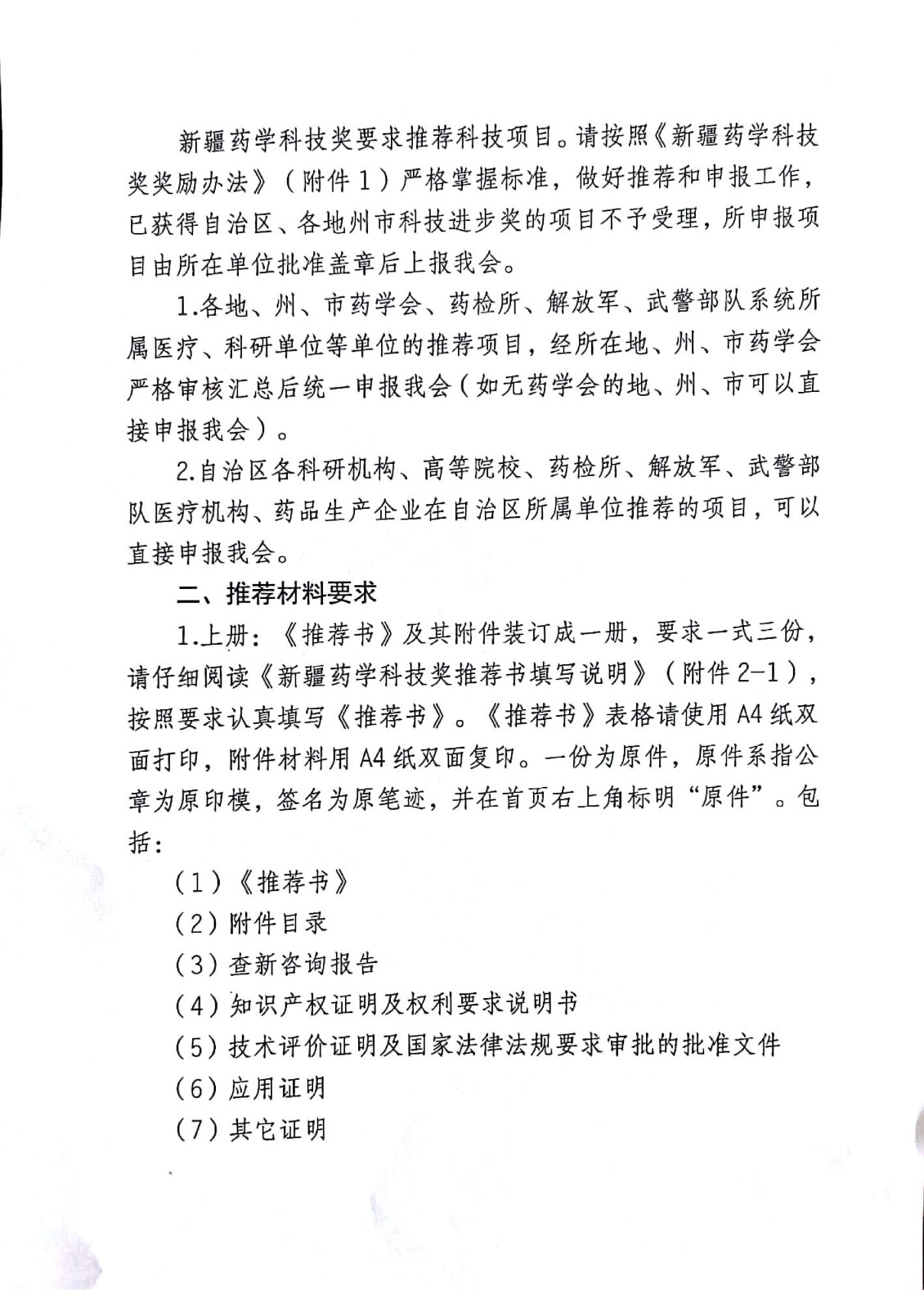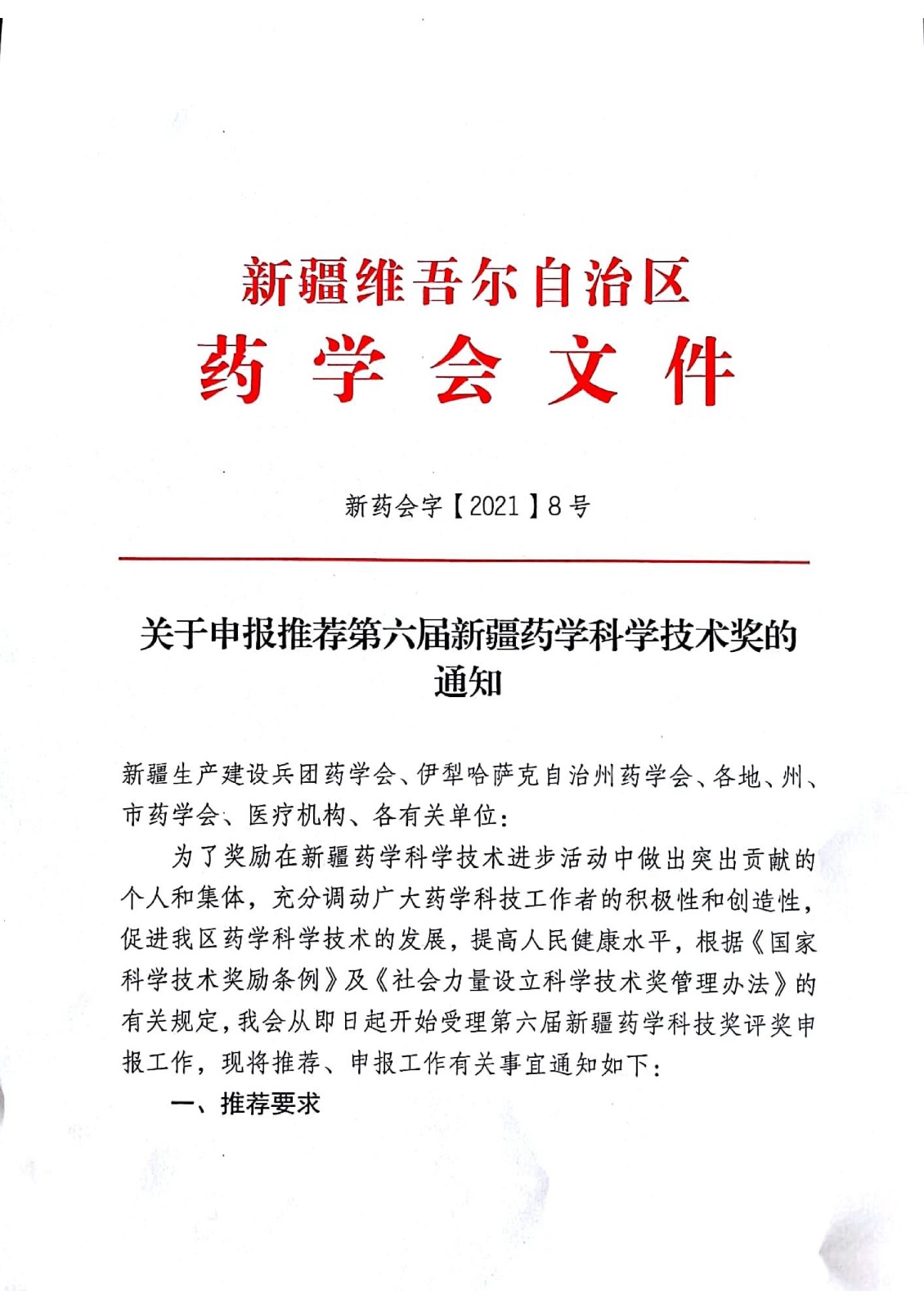 关于申报推荐第六届新疆药学科学技术奖的通知