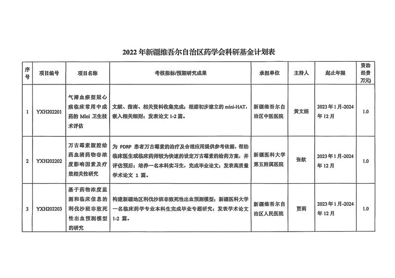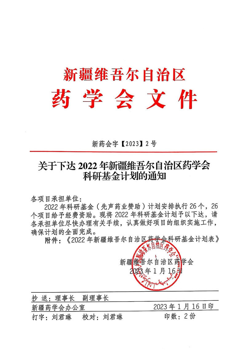 关于下达2022年新疆维吾尔自治区药学会科研基金计划的通知