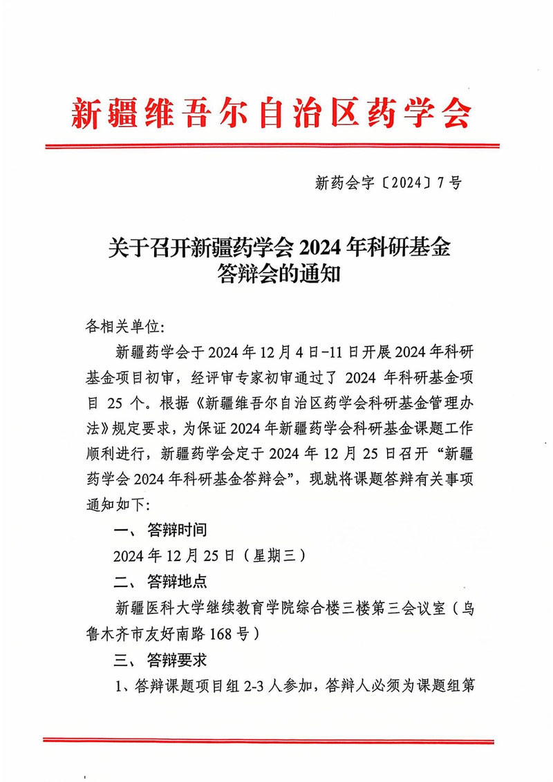 关于召开新疆药学会2024年科研基金项目答辩会的通知