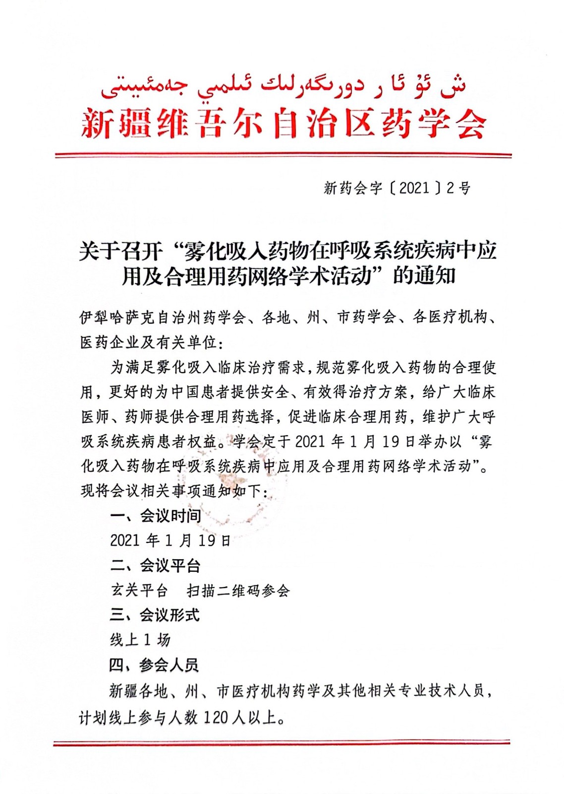 关于召开“雾化吸入药物在呼吸系统疾病中应用及合理用药网络学术活动”的通知