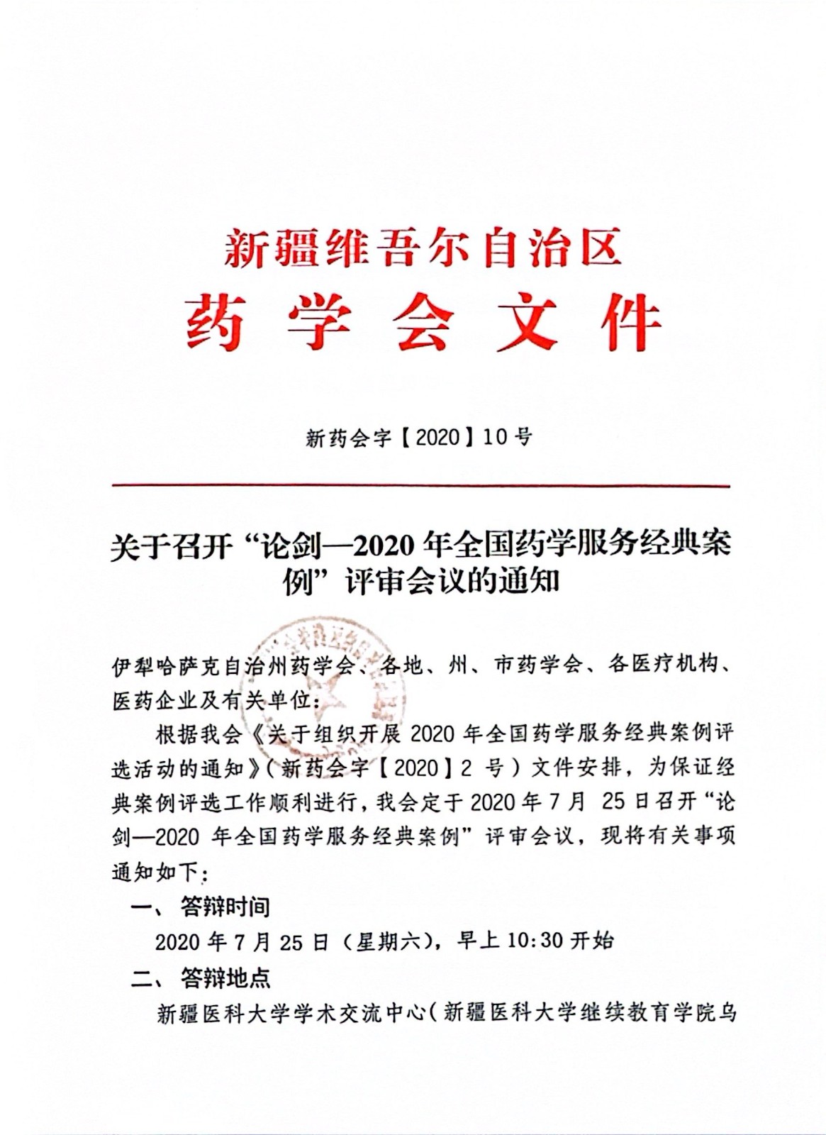 关于召开“论剑--2020年全国药学服务经典案例”评审会议的通知