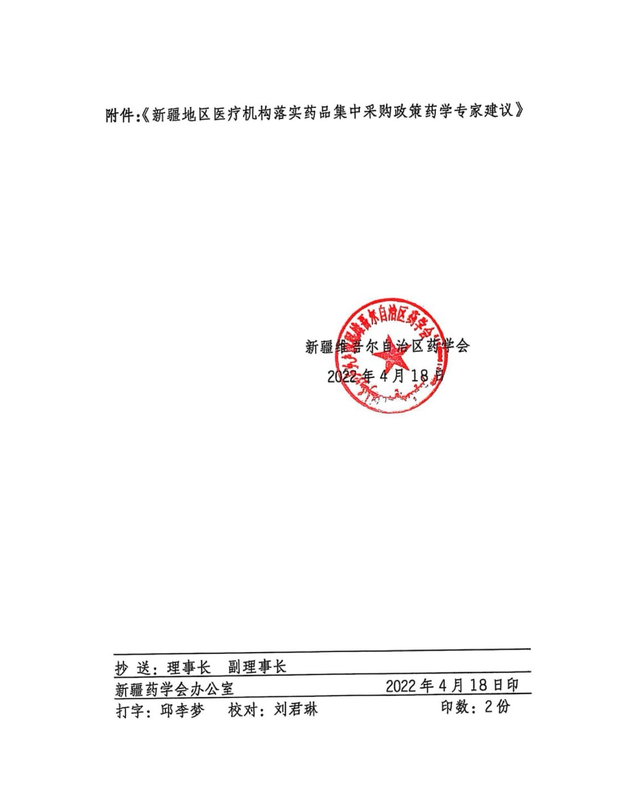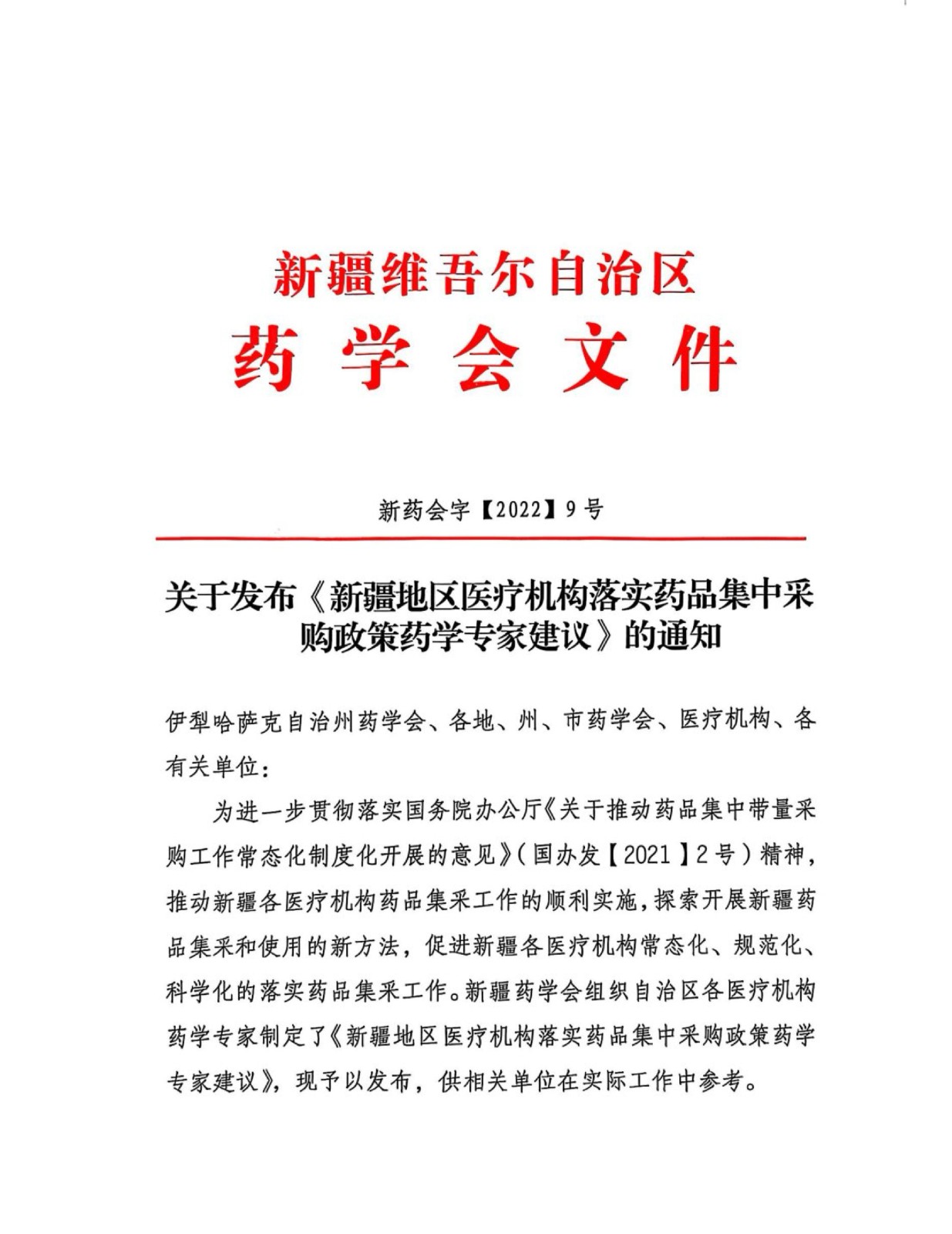 关于发布《新疆地区医疗机构落实药品集中采购政策药学专家建议》的通知
