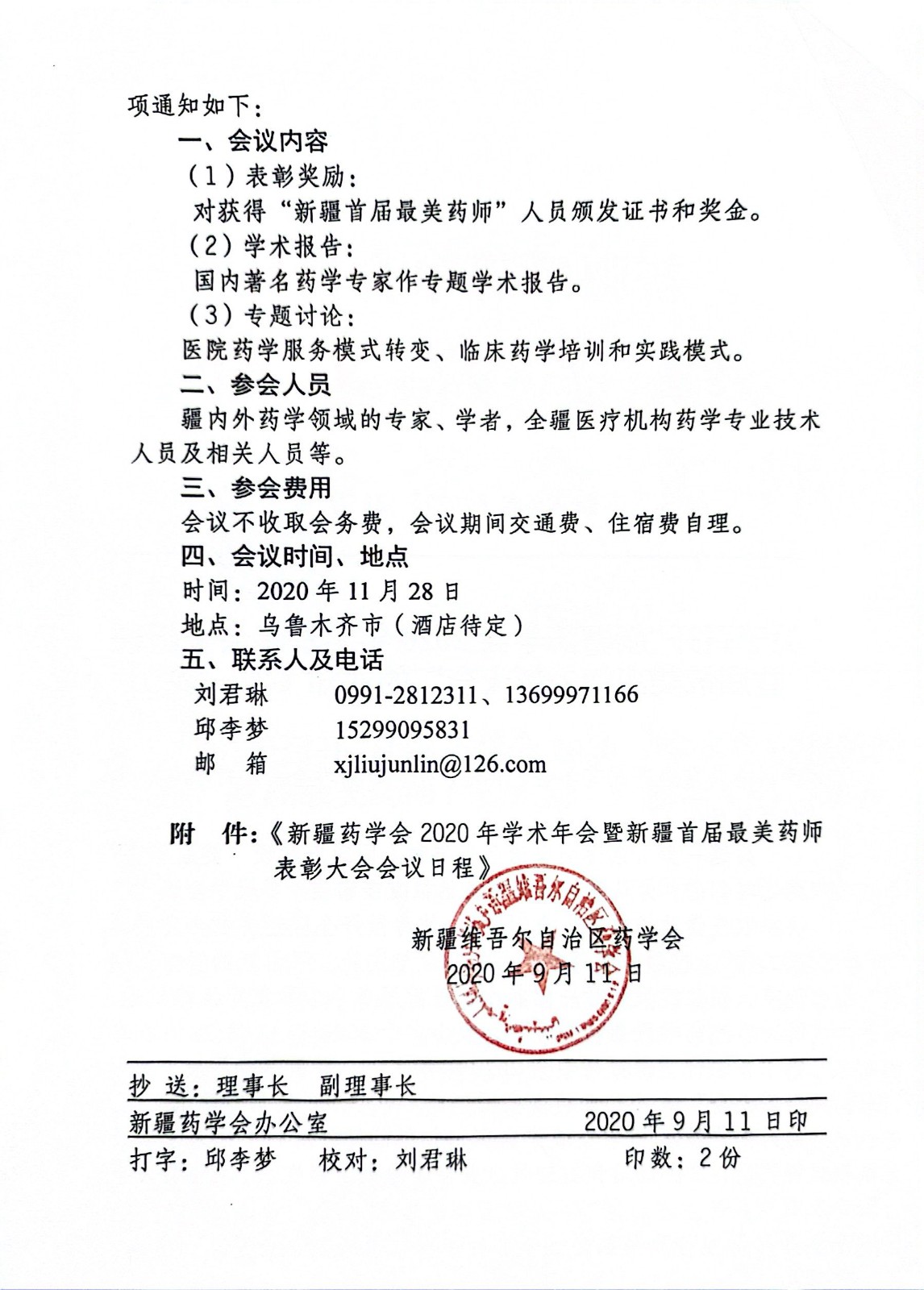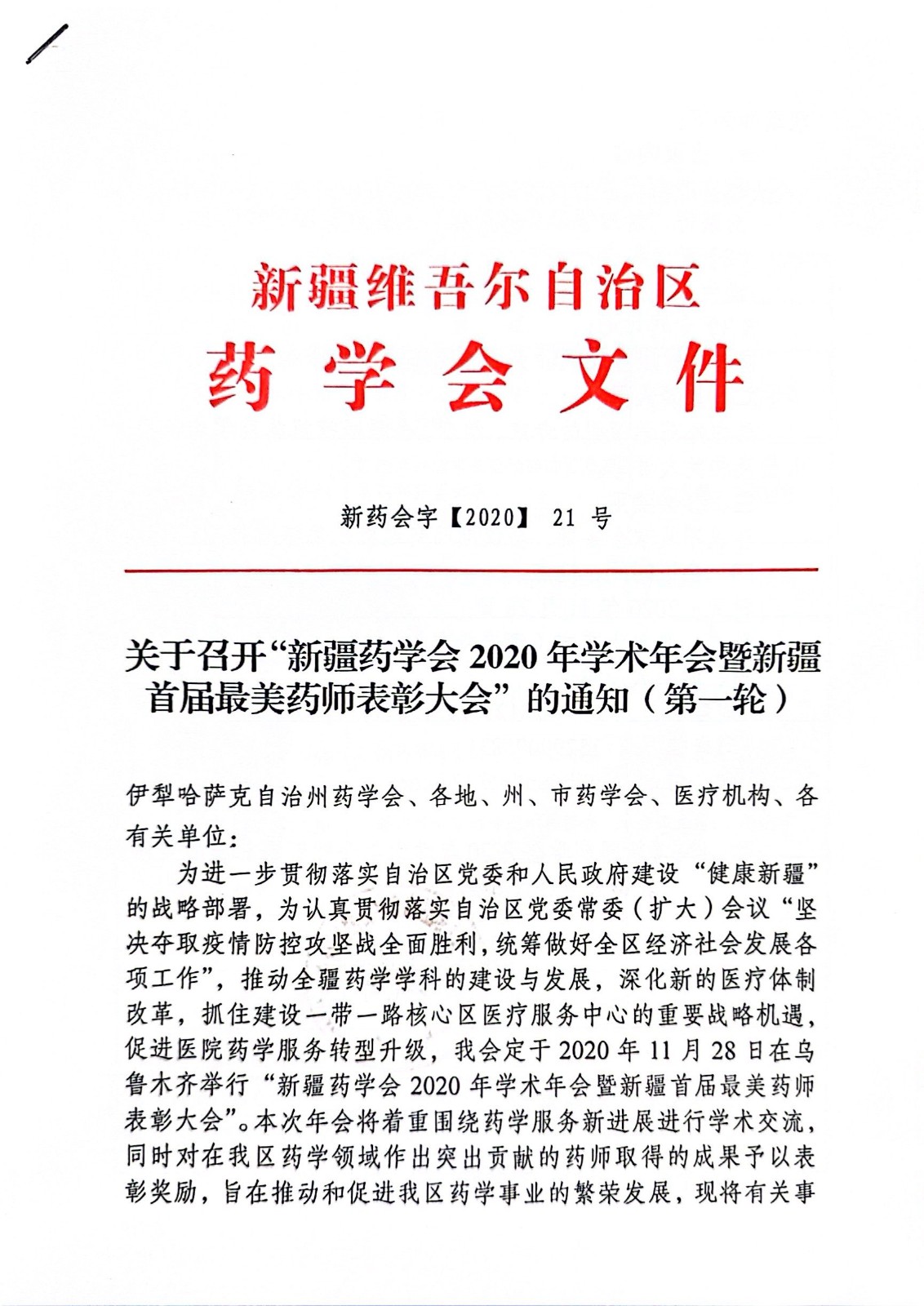 关于召开“新疆药学2020年学术年会暨新疆首届最美药师表彰大会”的通知(第一轮)