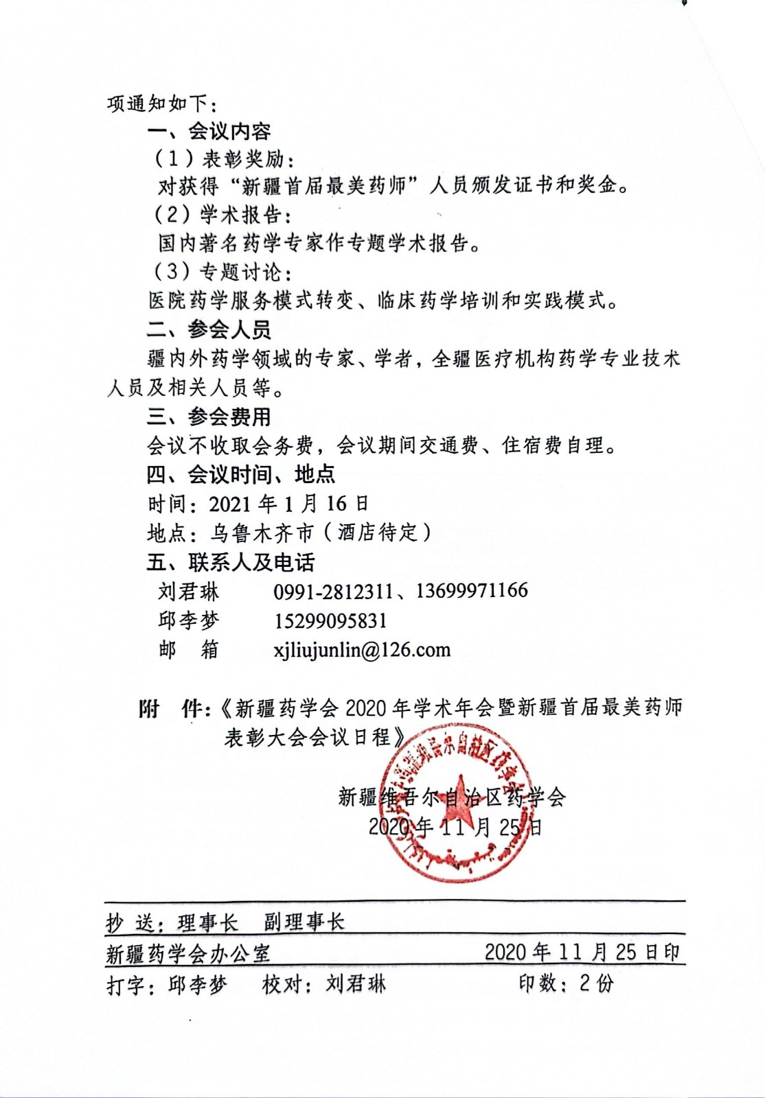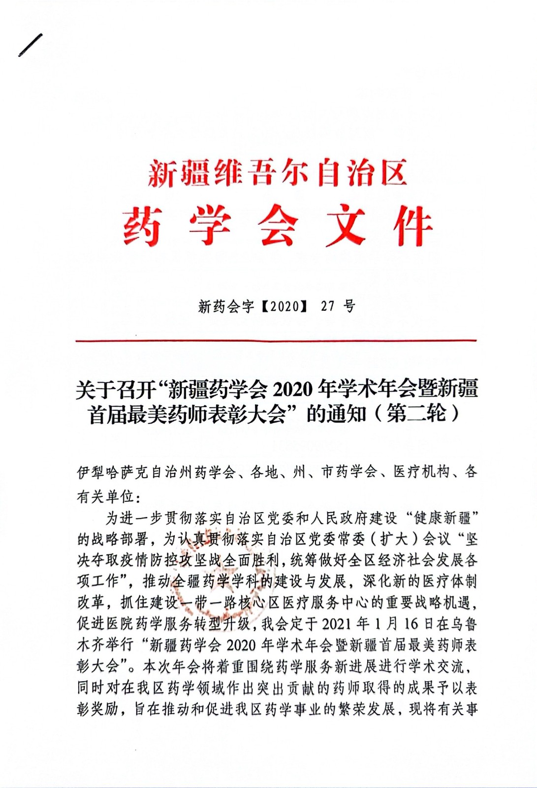 关于召开“新疆药学会2020年学术年会暨新疆首届最美药师表彰大会”的通知(第二轮)